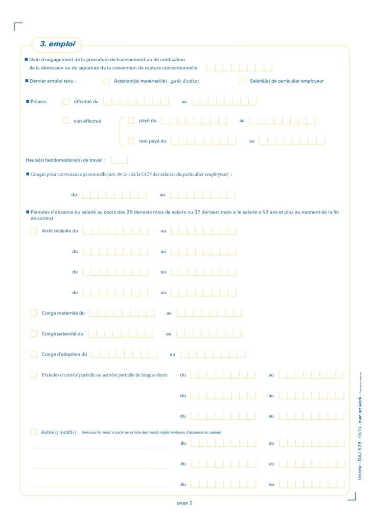 – en cas de démission : date à laquelle vous avez reçu (en mains propres ou par courrier) la lettre de démission de la salariée. - Dernier emploi tenu : Assistante maternelle ou Garde d’enfants